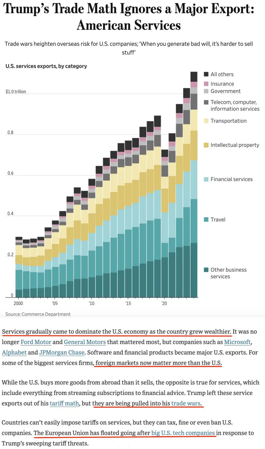 《华尔街日报》报道称,服务业已逐渐成为美国经济的主导力量皇冠信用网代理 。对于一些服务业巨头来说,海外市场现在比美国市场更重要。而随着美国关税大棒的频频挥起,这一被特朗普政府刻意忽略的贸易优势恰恰成了很多国家反制美国的有力抓手。