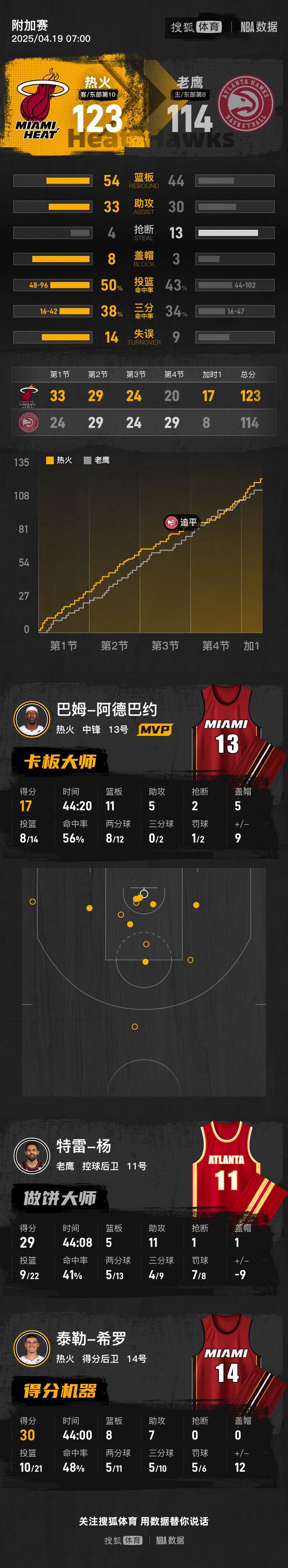 【搜狐体育战报】北京时间4月19日NBA附加赛,客场作战的热火以123-114加时击败老鹰,锁定东部第八,晋级季后赛hga026注册 。阿德巴约17分11篮板5助攻,杨29分5篮板11助攻。