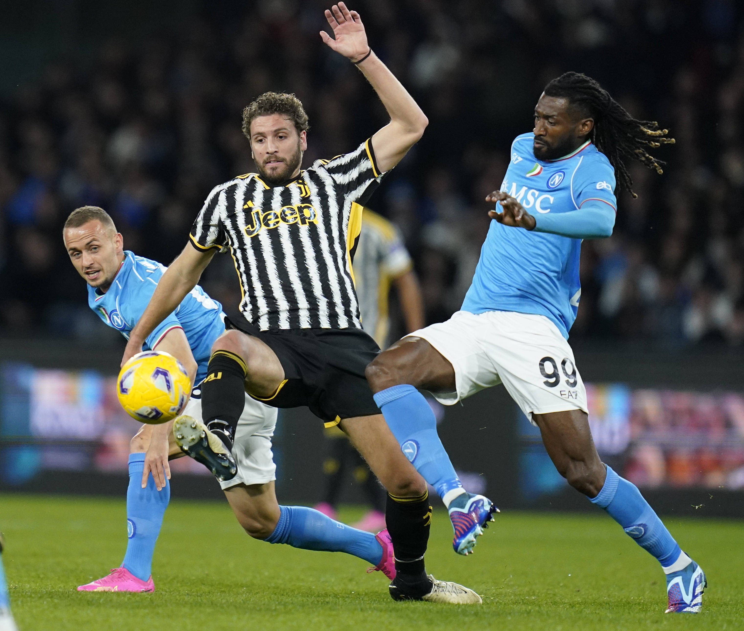 3月3日,尤文图斯队球员洛卡特利(中)与那不勒斯队球员洛博特卡(左)、安古伊萨在比赛中拼抢那不勒斯足球。